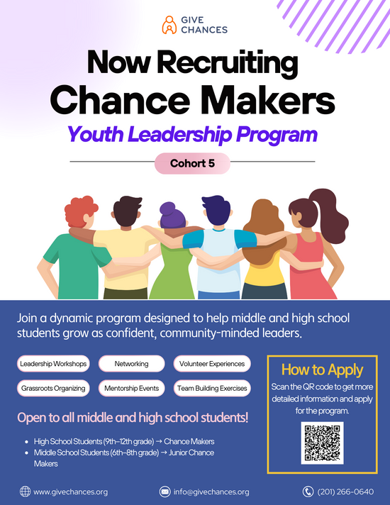 Chance Makers is a Youth Leadership Council at Give Chances, open to middle and high school students who are passionate about leadership, wellness, and community service. As student ambassadors of Give Chances, members play a vital role in advancing educational equity and mental health awareness by uplifting the academic and emotional well-being of peers from low-income and immigrant backgrounds.