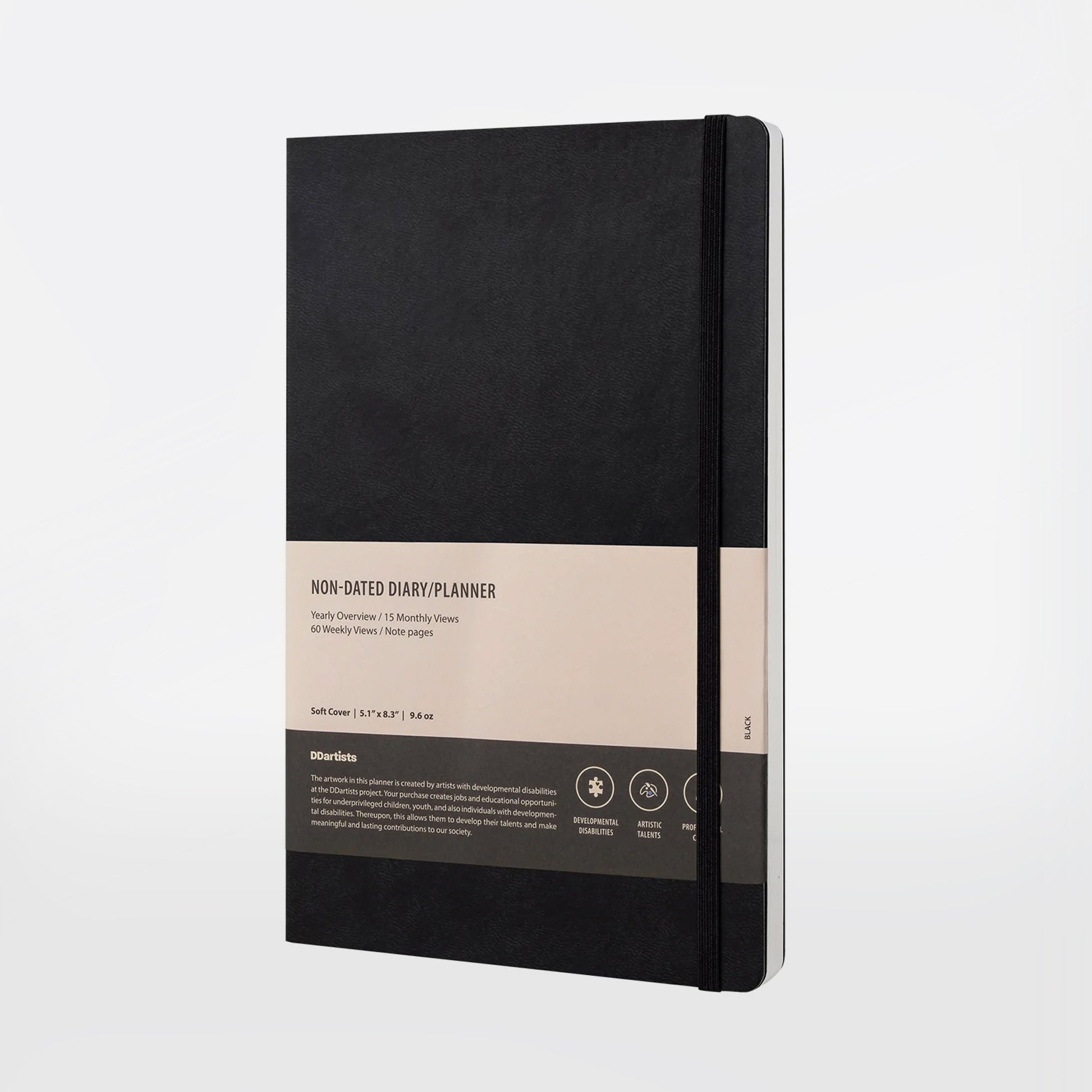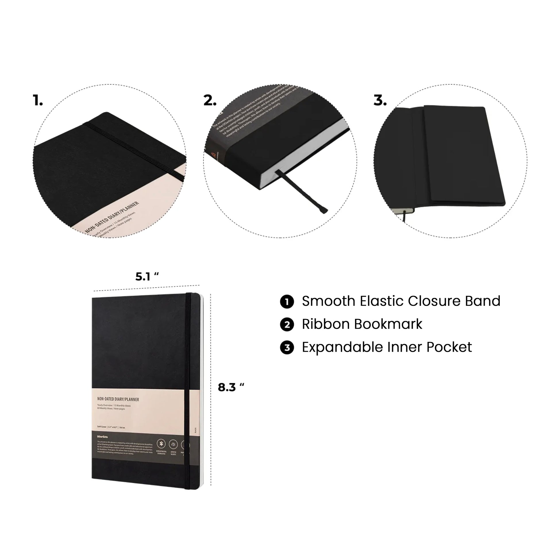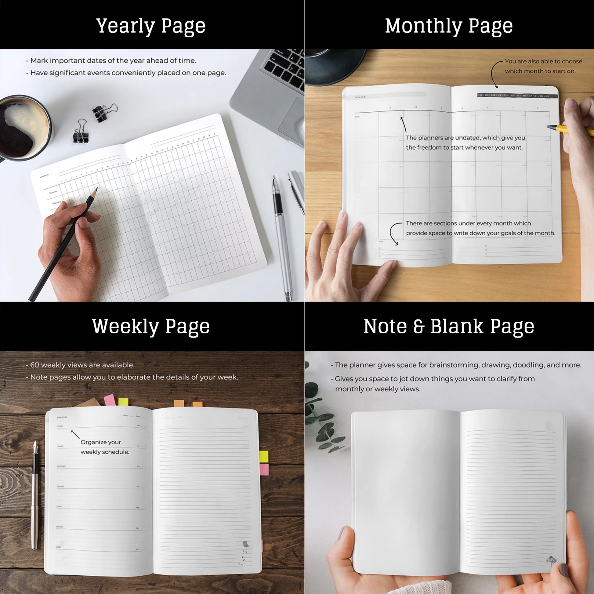 Each planner is undated and includes a yearly page, 15 monthly views, 60 weekly views, and a free-write section. The date range covers a full year and is distributed into sections.