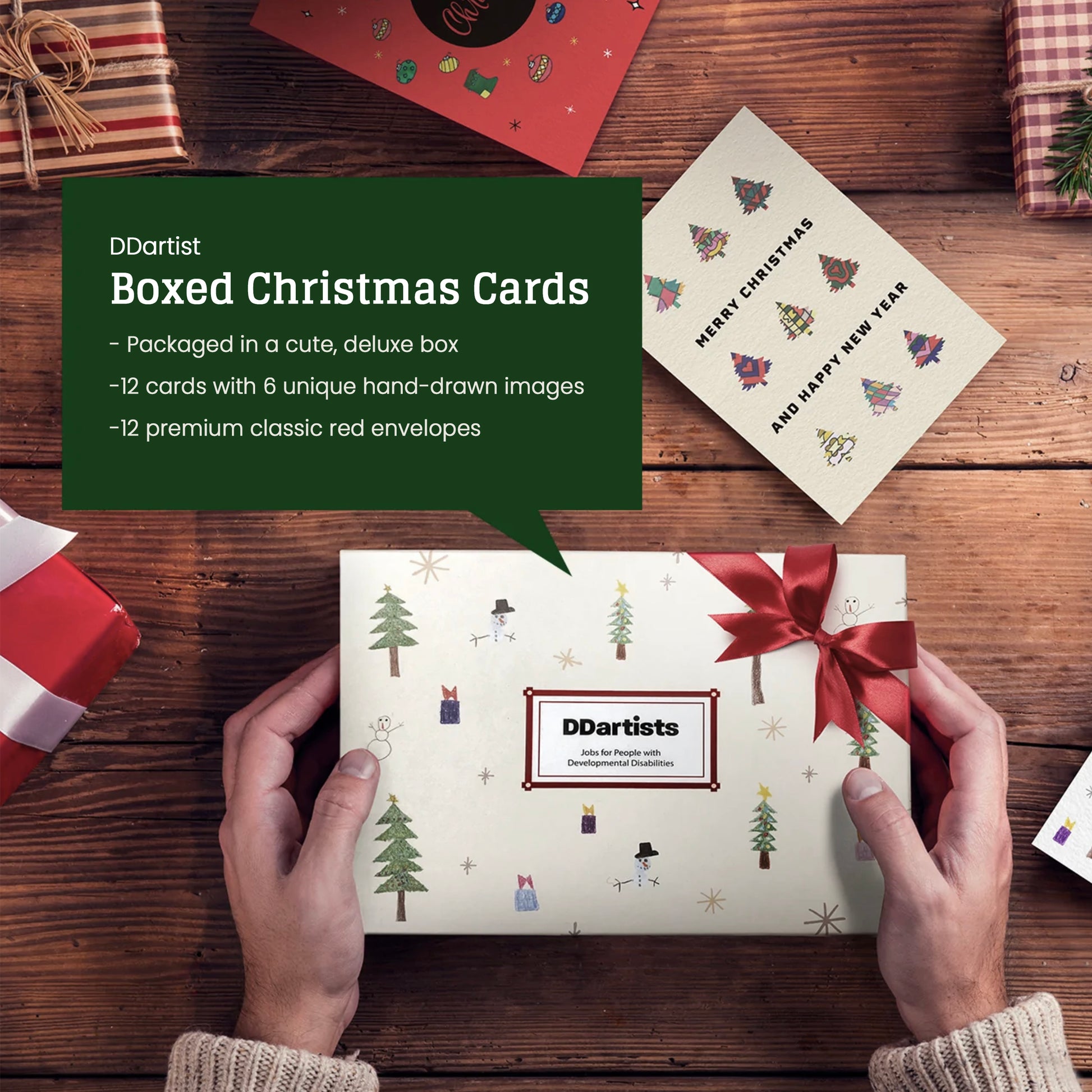12 premium Christmas cards featuring 6 unique designs created by artists with developmental disabilities