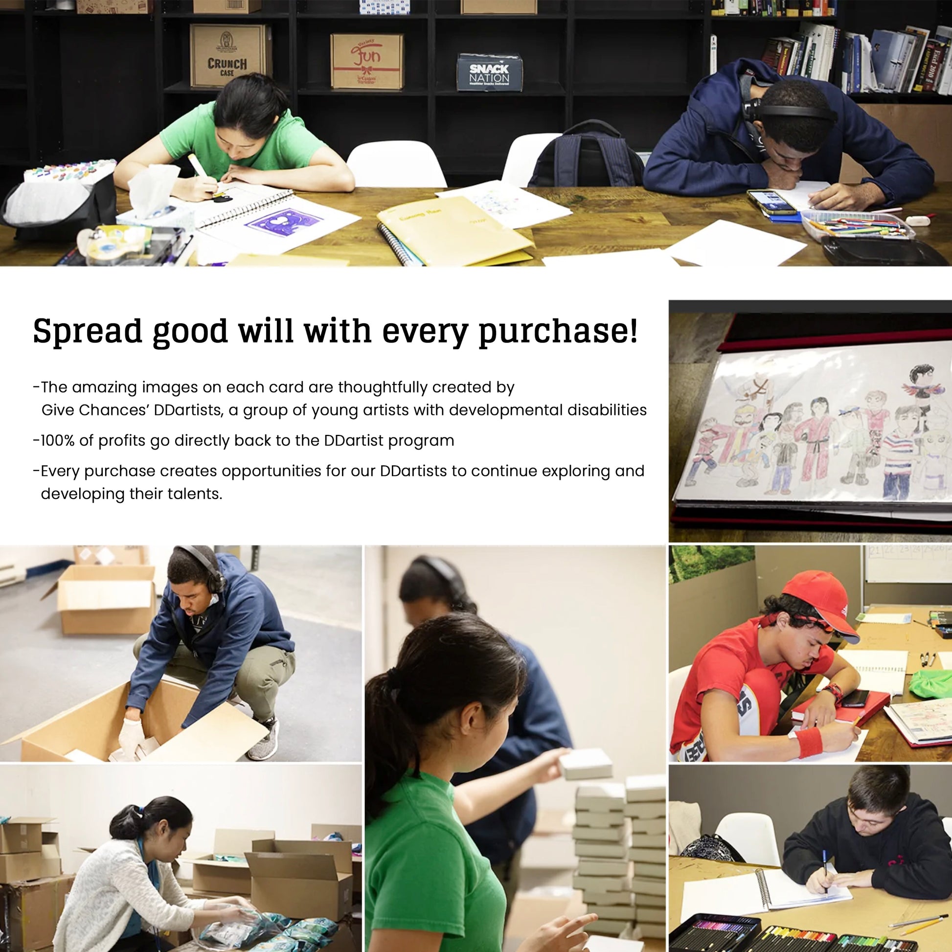 • Every purchase creates opportunities for our DDartists to continue exploring and developing their talents